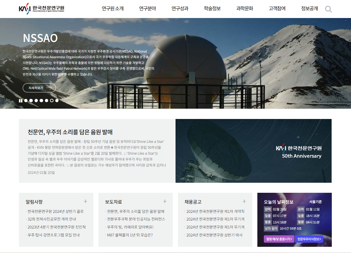 한국천문연구원 홈페이지에 들어가면, 메인화면 우측 하단에 날짜별 또는 지역별 일출 및 월출정보를 확인할 수 있다.