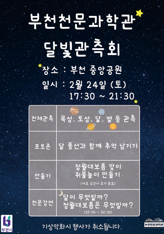 집에서 가까운 부천시 부천천문과학관에서 정월대보름 행사로 '달빛관측회'를 운영할 예정이다.