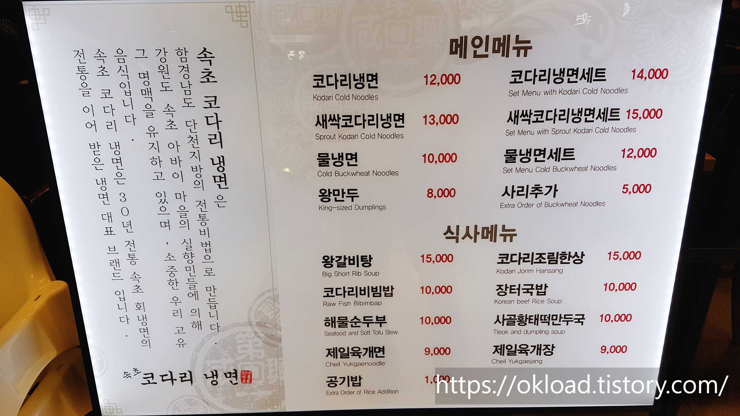 코다리를 메인으로 한 냉면전문점이라는 것을 메뉴판에서도 알 수 있다. 갈비탕, 순두부, 비빔밥 등 식사메뉴도 있지만 단연 이 가게의 메인은 코다리와 냉면이다.