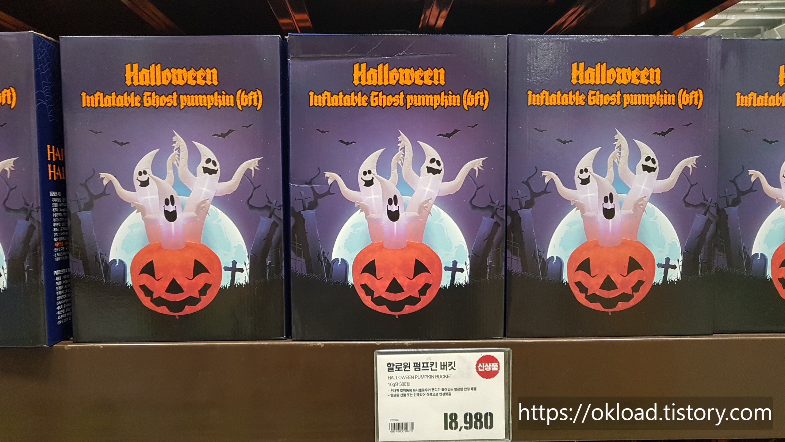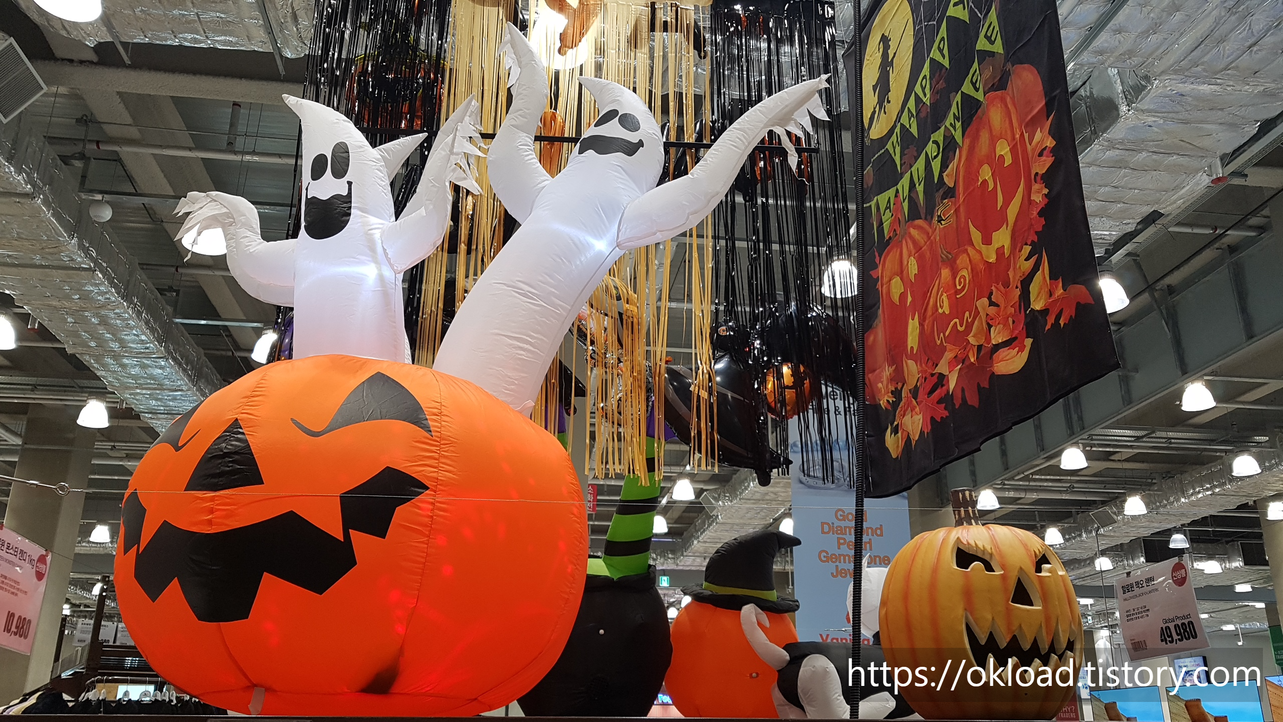 모든 소품과 장식들을 사진에 담지는 못하였지만, 5개의 핼로윈 분위기 인형이 연결된 인형세트인 '할로윈 인플레터블 펌킨유령 패밀리' 가격은 84,800원 / 할로윈 잭오 랜턴은 49,980원에 판매 중이다.