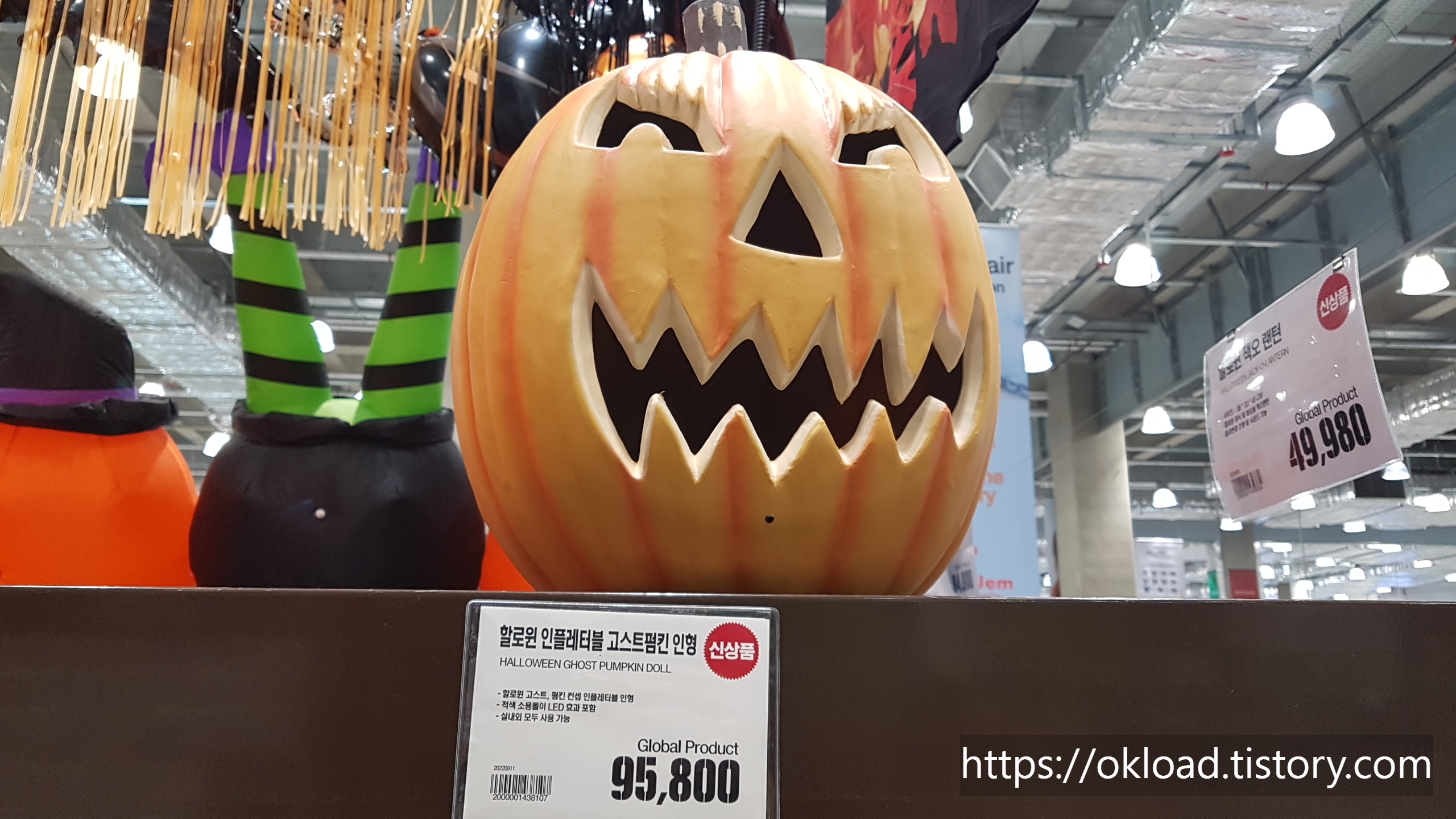 가장 먼저 눈에 띄고 관심이 간 물품은 '할로윈 인플레터블 고스트펌킨 인형'이었다. 제법 사이즈가 컸음에도 95,800원이라는 비교적 저렴한 가격에 판매하고 있었다. 핼로윈 파티에서 빠져서는 안 되는 소품이 호박이 아닐까 싶다.