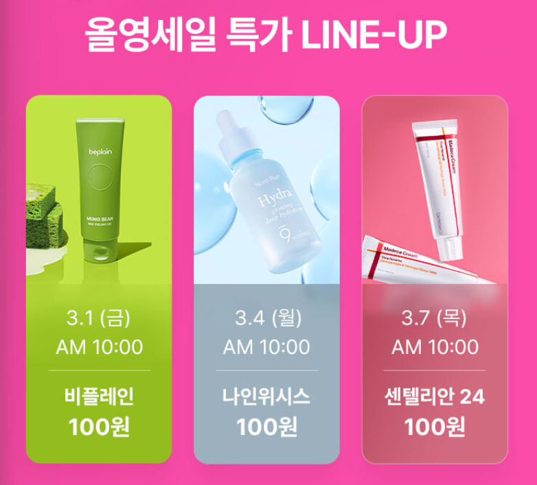 매일 오전 10:00 시작으로 한정 수량으로 특가 100원에 판매하는 화장품이 있다.