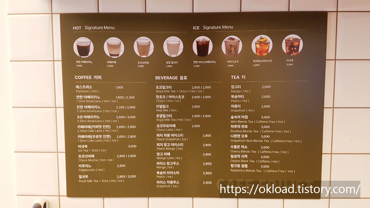 모두 HOT 따뜻한음료 기준으로 전체메뉴에서 일부만 적어봤다. 자세한 메뉴판은 위 사진을 클릭하여 확대 확인하길 바란다.