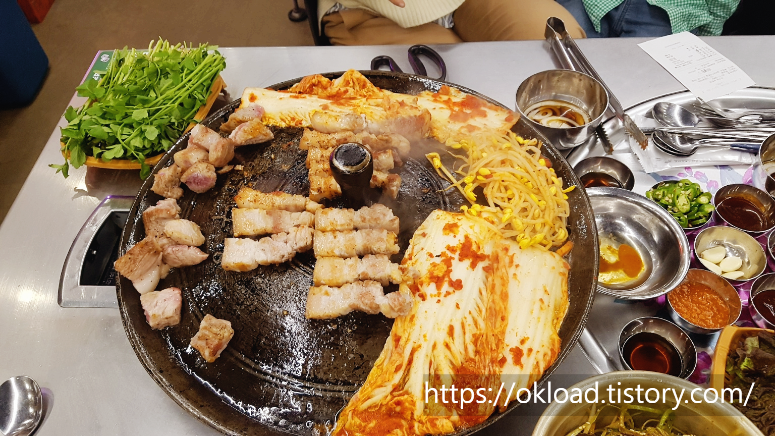 추가로 주문한 미나리와 기본적으로 솥뚜껑불판에 올려지는 콩나물, 배추김치가 어우러져 상큼하면서도 느끼하지 않은 담백한 삼겹살 고기맛을 느낄 수 있다.