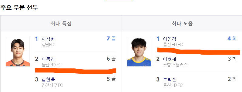 득점 및 도움 부분 모두에서 상위권에 올라간 유일한 선수이기도 하다. 아직 26세에 불과한 이동경 선수의 향후 성장이 기대된다.