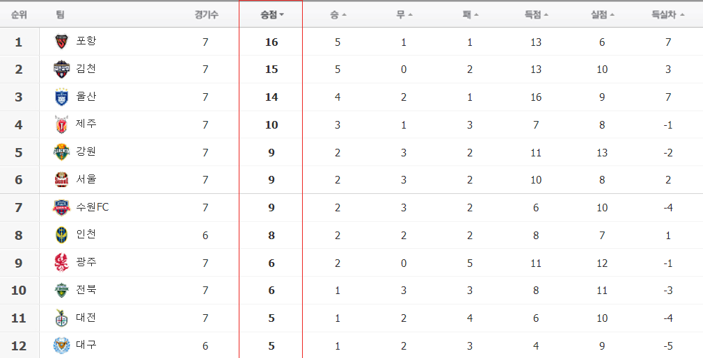 포스팅을 작성하고 있는 현재일 기준으로 울산HD는 승점 14점으로 3위를 기록하고 있다.
