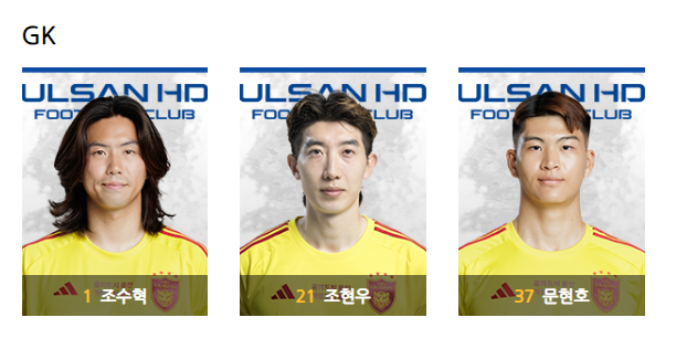국가대표 수문장 '빛현우'라고도 불리는 조현우 선수를 포함하여, 조수혁, 문현호가 2024년도 현대HD FC의 골키퍼를 맡는다.