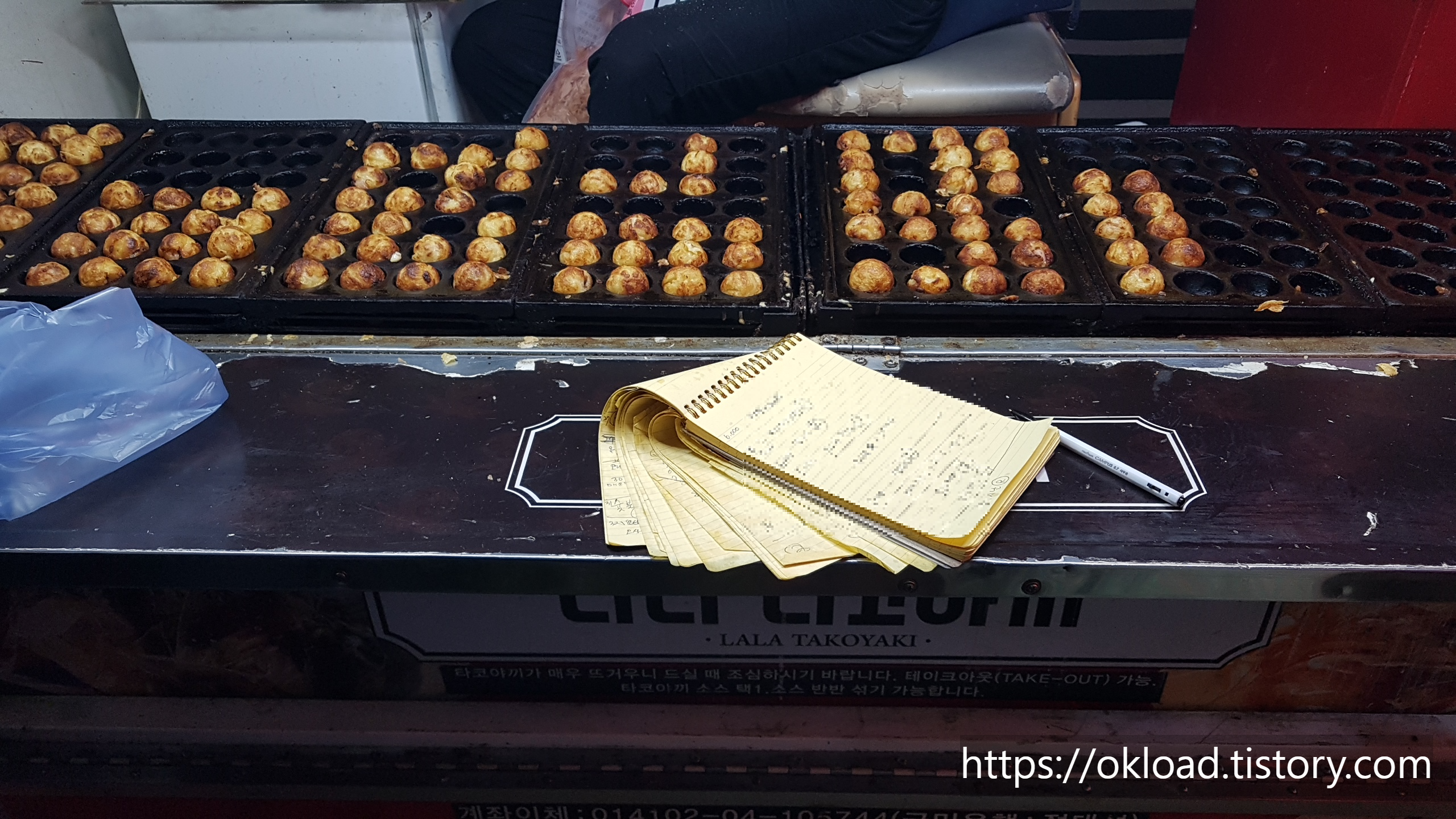 그리고, 병원 동네병원 수납창구에서 볼법한 대기자 작성 리스트가 선반에 놓여있는데, 가게를 오는 순서대로 메뉴와 수량을 메모지에 적고 기다리면 된다. 현금을 잘 가지고 다니지 않는 트렌드에 맞게, 대부분의 대기자들은 주문내역을 메모지에 적은 후 카카오페이나 계좌이체로 미리 결재를 해둔다. 사장님은 다꼬야끼를 굽고 돌리고, 담고, 포장하고 하느라 정신이 없어서 계좌이체 내역을 일일이 확인도 안 하고 손님이 이체했다고 말하면 이를 믿고 포장한 다코야키를 손님에게 내어준다. 판매자와 소비자의 거래관계에서 신뢰가 깔려있기에 가능한 거래시스템이다. 차가운 키오스크 기계에 결재하는 것보다 훨씬 인간적이고 효율적인 결재 시스템이다.