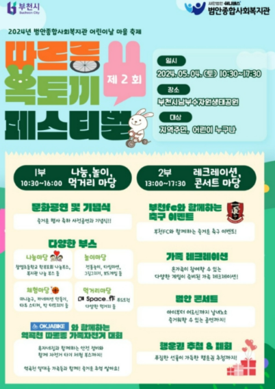 부천FC와 함께하는 축구 이벤트, 놀이마당, 체험마당, 먹거리마당, 범안콘서트 공연, 자전거 대여 등 체험과 다양 볼거리가 넘치는 제법 규모가 있는 어린이날 행사다.