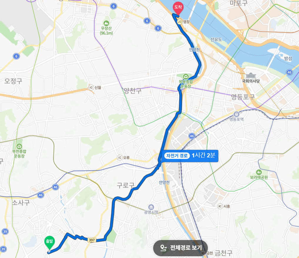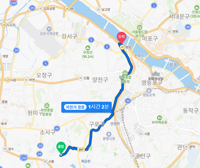 포털 길찾기 지도에서는 자전거 경로 시간이 1시간 2분이 예상되는 코스였는데, 이는 한 번도 쉬지 않고 갔을 때 평균인이 기록할 수 있는 시간이었다.
