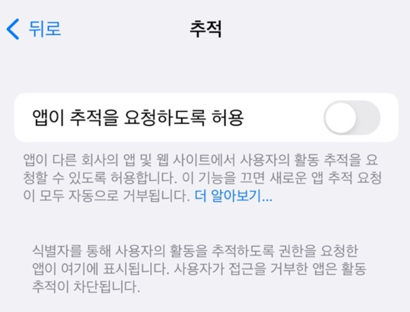 이처럼 '앱이 추적을 요청하도록 허용' 글씨 옆의 버튼이 녹색으로 바뀌면, 추적기능 활성화가 정상적으로 이뤄진 것이다.