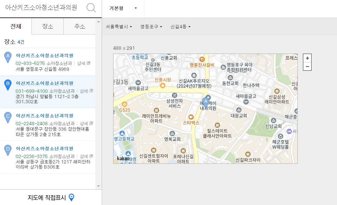 다음 지도에서 '아산키즈소아청소년과의원'이라고 검색하니, 동일 병원명으로 총 4건이 검색되었다. 영등포 신길동, 하남시 망월동, 성동구 금호동 등이다.