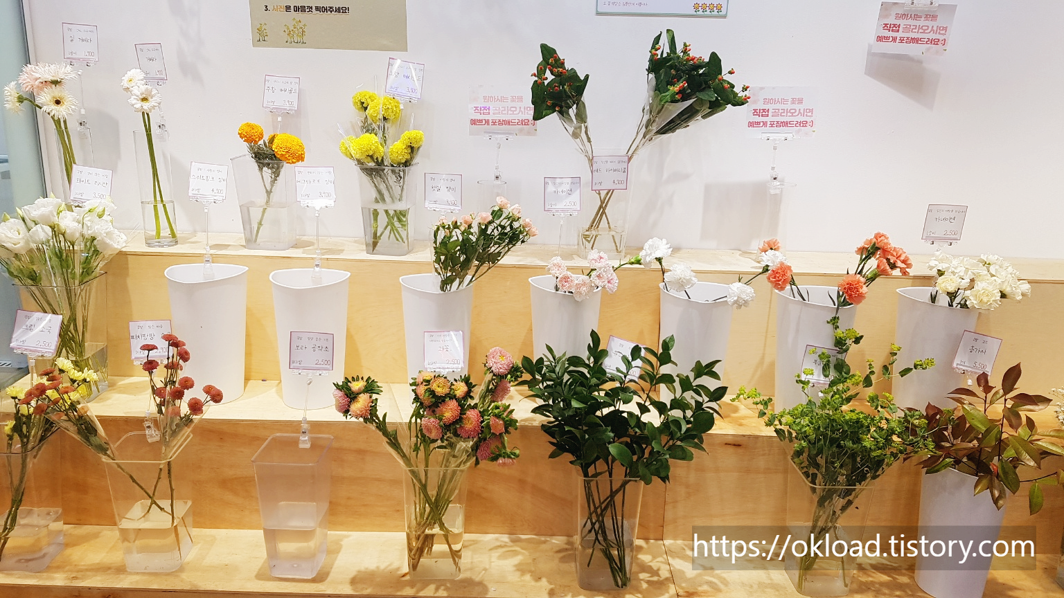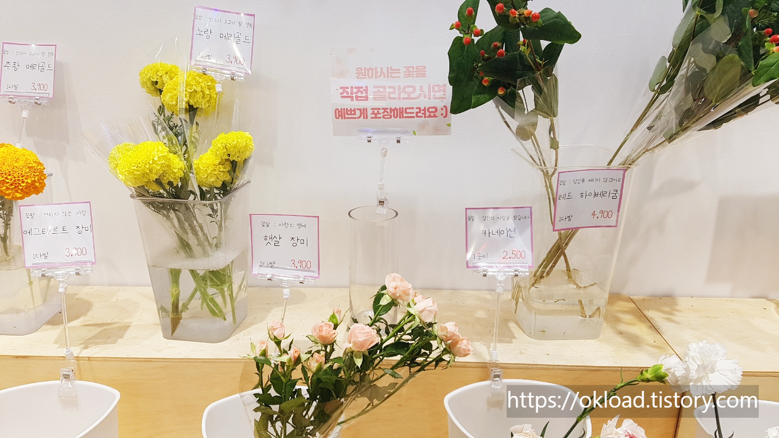 한 송이 또는 한묶음씩 원하는 꽃과 식물을 소비자가 선택해서 조합하여 직원에게 드리면 예쁘게 포장해 주는 꽃집이다.