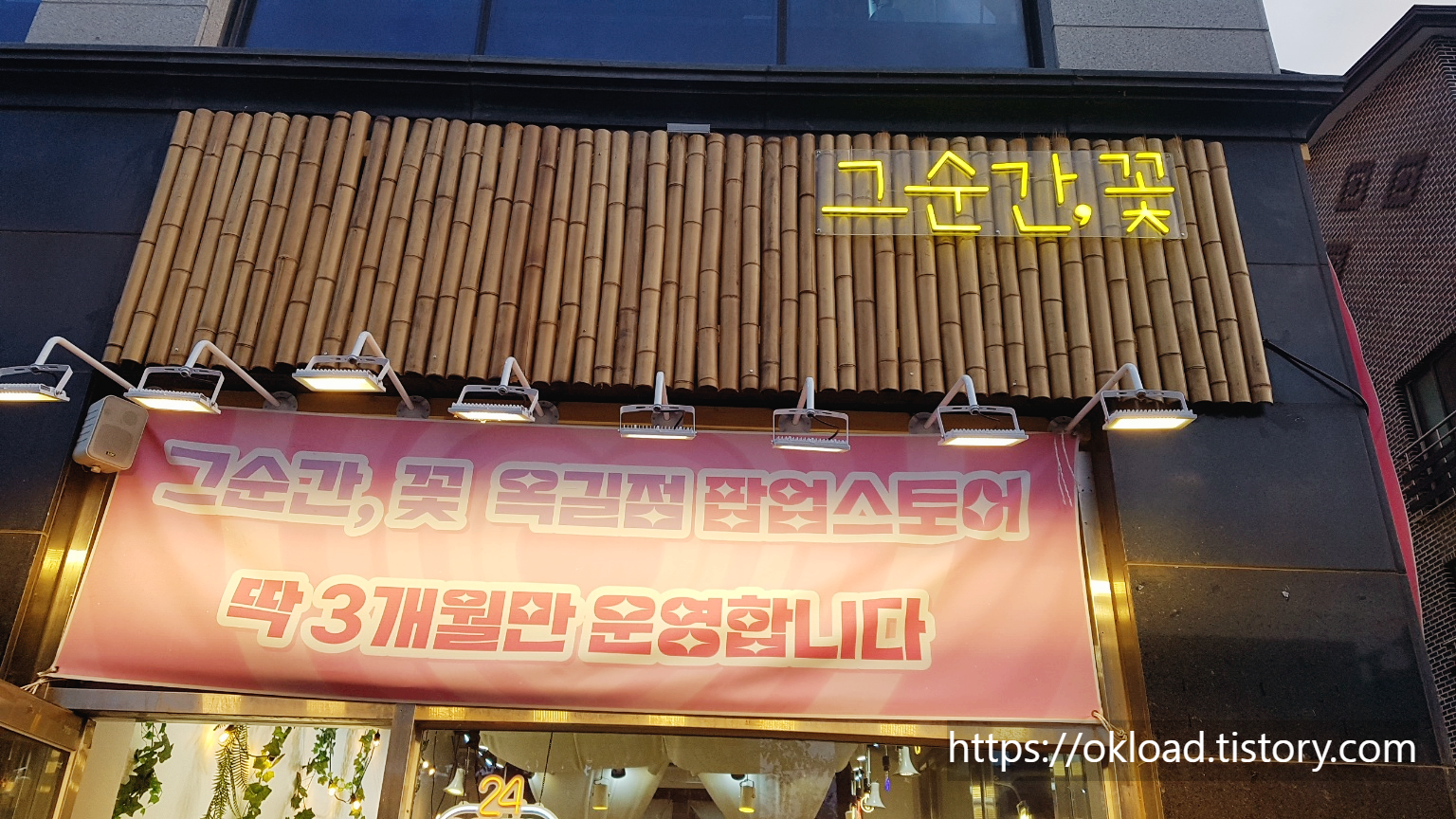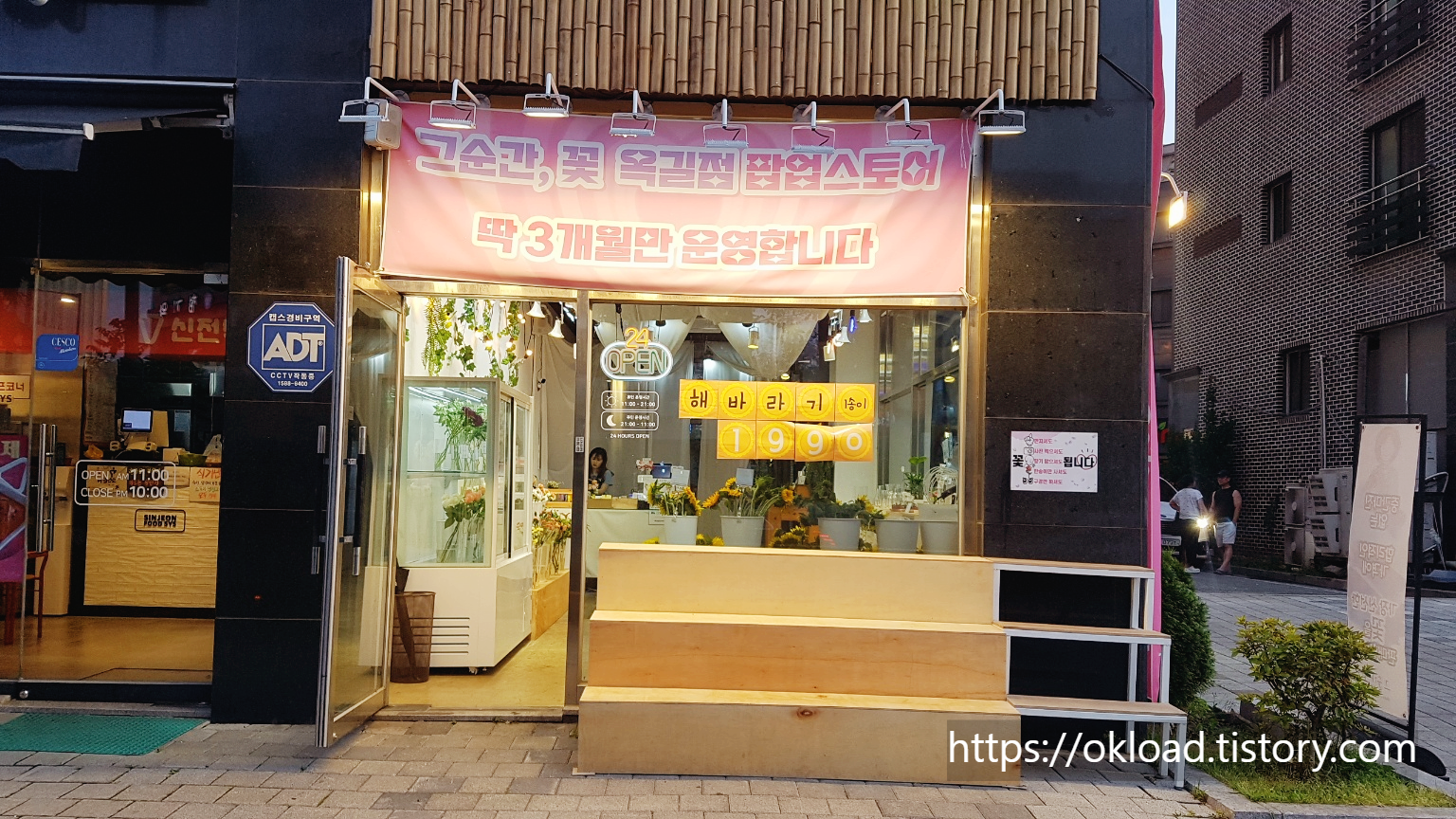 꽃집 간판 위에 '딱 3개월만 운영합니다'라는 현수막이 걸려있는데, 이미 3개월은 지난 것으로 보인다.