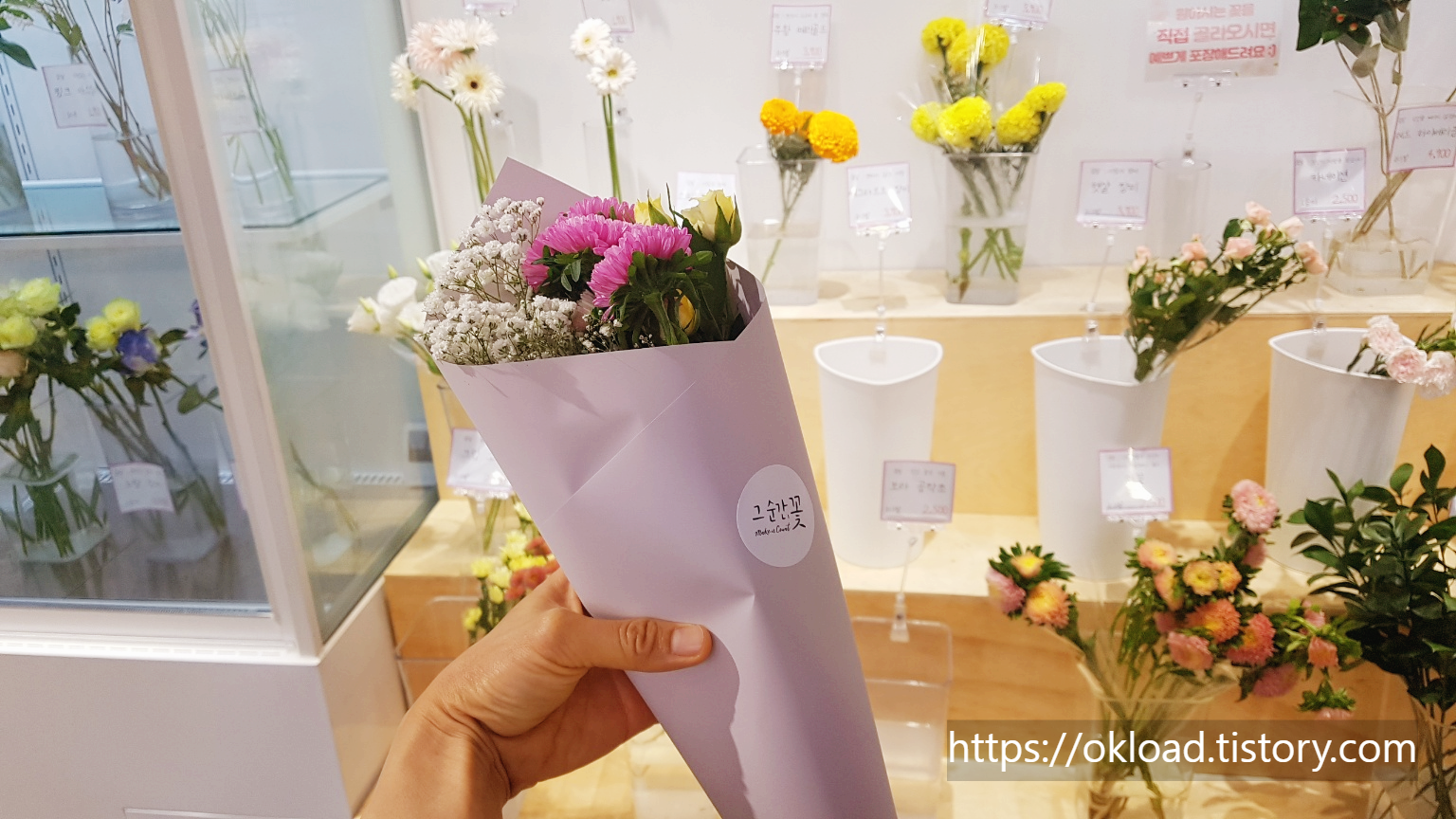 직접 내 손으로 꽃을 골라서 만들어진 꽃다발이라 그런지 더 예쁘고 특별해 보인다.