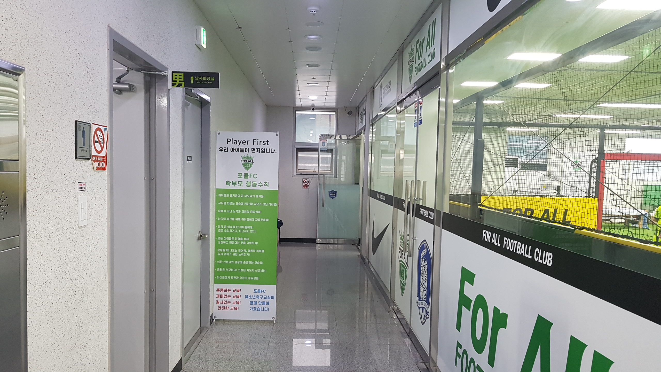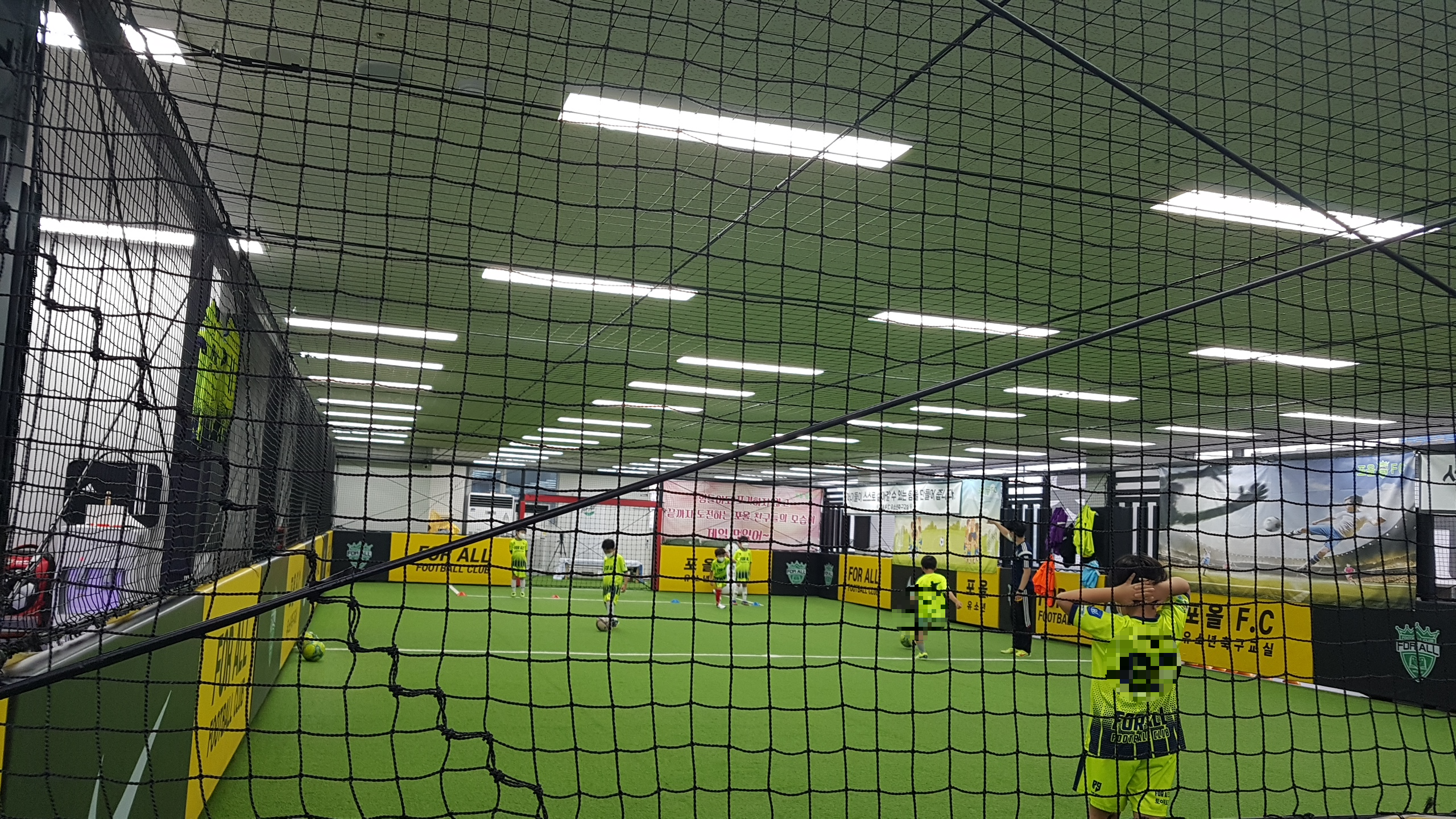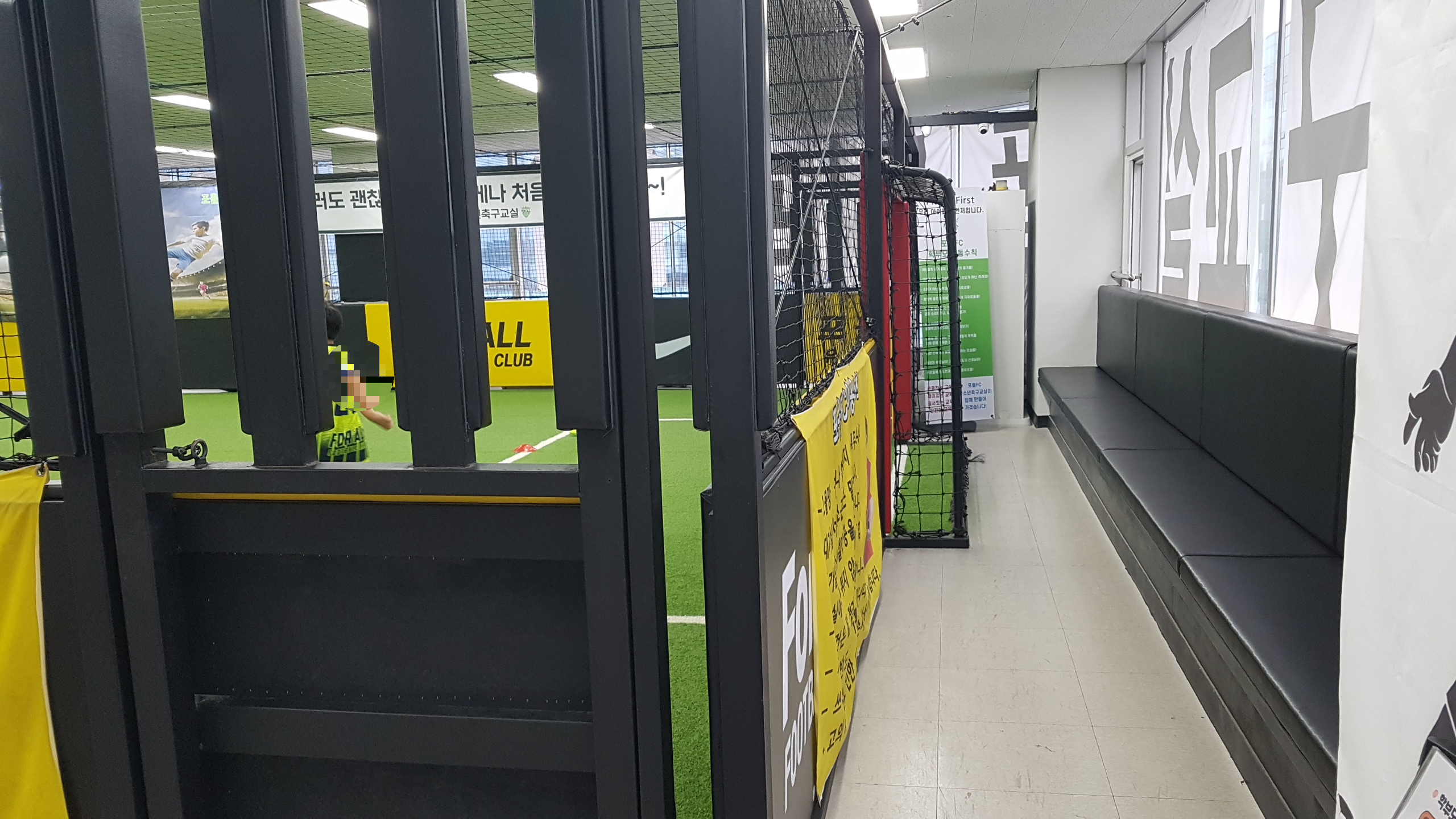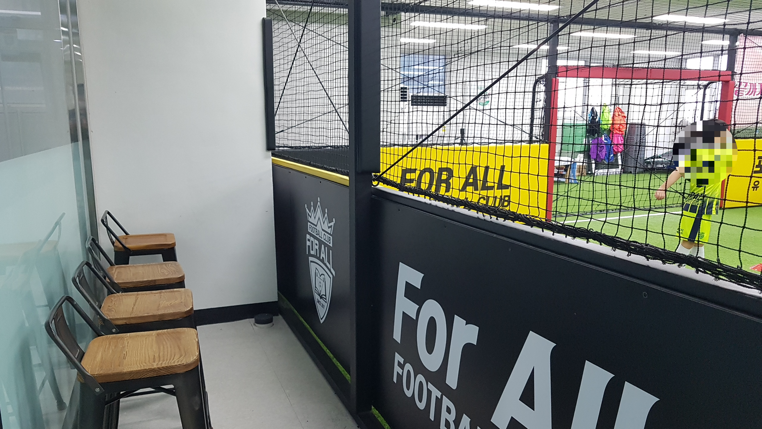 실내축구장 주변으로는 벤치와 의자가 마련되어 있다. 학부모가 축구 수업을 관람하며 대기하는 공간은 충분하다. 한 가지 아쉬운 점은 골대 뒤편의 밴치는 쿠션감이 있으나, 긴 가로라인 외곽이 비치된 의자들은 쿠션감이 전혀 없고, 대부분 허리받침 부분이 허술한 철재로 되어 있어서 수업시간 동안 앉아있기에는 불편하다. 시야를 가리지 않고 경기장을 바라보려면 높은 의자가 필요했을 건데, 차라리 쿠션감 있는 계단형 긴 벤치를 설치하는 게 낫지 않았을까 싶다. 학교 운동장 관중석과 같은 계단형 좌석 말이다. 계속 디스 성격의 글만 적어서 포올 측에 미안한 마음이 든다. 급작스럽지만, 이러한 요소들을 배제할 만큼 코치진의 열정과 능력은 출중하다. 코치는 유소년 코칭에 최적화된 노련한 지도력을 지녔다. 그래서 포올축구교실이 맘카페에서 평이 좋은가 보다. 대치동이나 목동에 거주하지도 않는 수험생들이 힘들게 대치동과 목동의 학원을 다니는 이유가 일타강사 때문이지 건물, 책상, 의자 등의 시설 때문은 아니다.