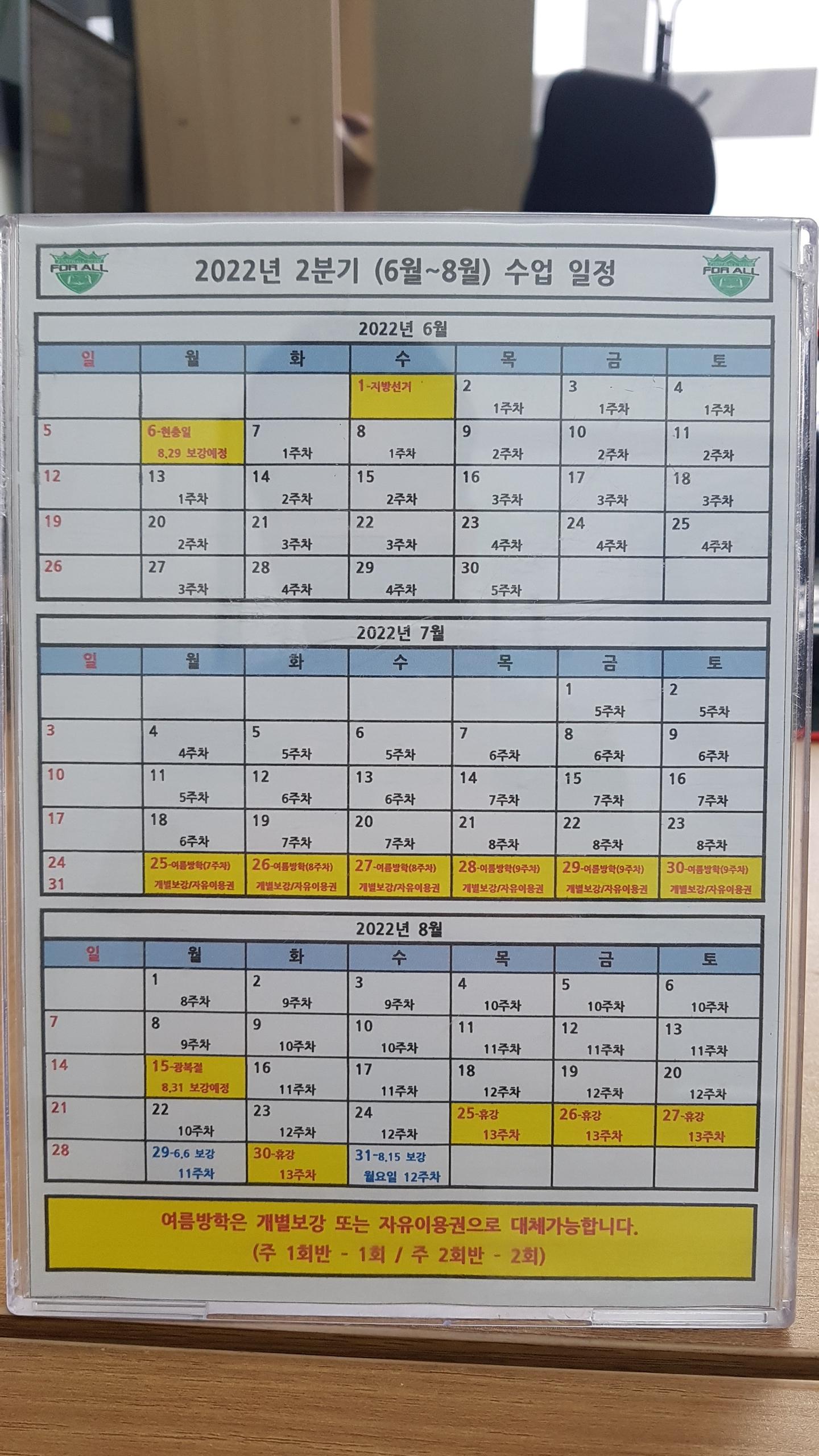 포올축구교실 사무실 앞에 게시된 2022년도 2분기 수업 일정이다. 눈에 띄는 게 학원방학으로 인한 휴강은 보강 또는 자유이용권으로 대체된다는 것이다. 학원비에서 차감되지 않고, 부족한 일수는 개별보강과 자유이용권 중 하나를 선택해서 사용할 수 있다는 것이다. 개별보강은 다른 수업일 다른 수업에 참여하는 것이고, 자유이용권은 수업이 없는 시간대에 1시간 동안 실내 풋살장을 이용할 수 있는 거다. 아마 대부분 보강을 택하지 않을까 싶다.