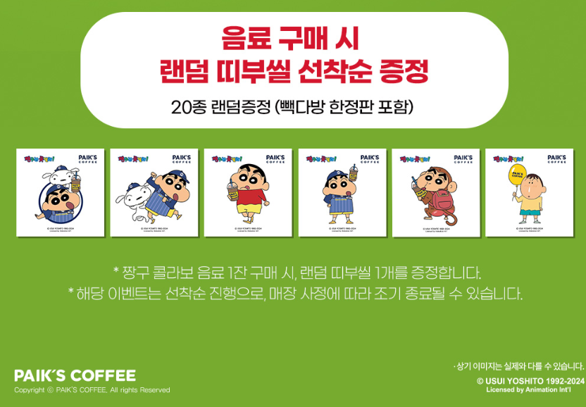 짱구 콜라보 음료를 1잔 이상 구입하면, 현장에서 랜덤으로 띠부씰 1개를 받을 수 있다.