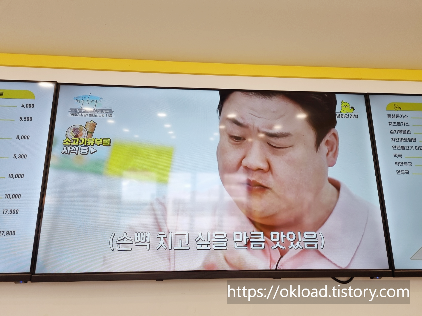 병아리김밥에서 판매하는 김밥 메뉴 일부의 실물이다.