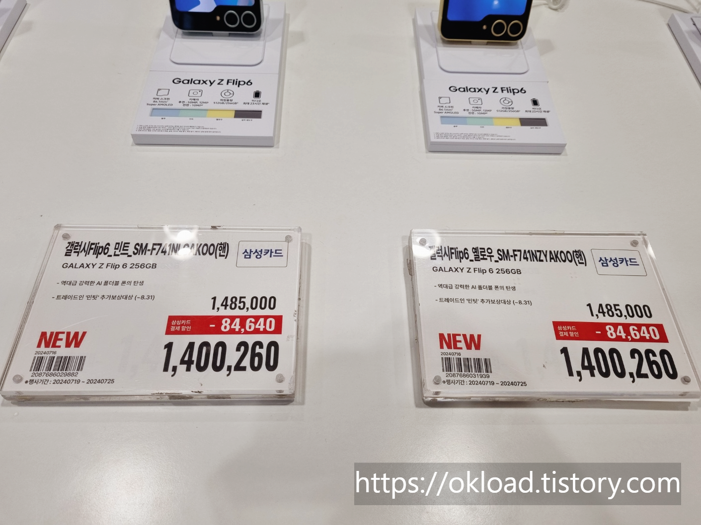 오프라인 삼성전자 가전매장에서 판매되는 갤럭시플립6는 삼성카드 카드할인을 받았을 때, 기기값 1,400,260원에 구입할 수 있다.