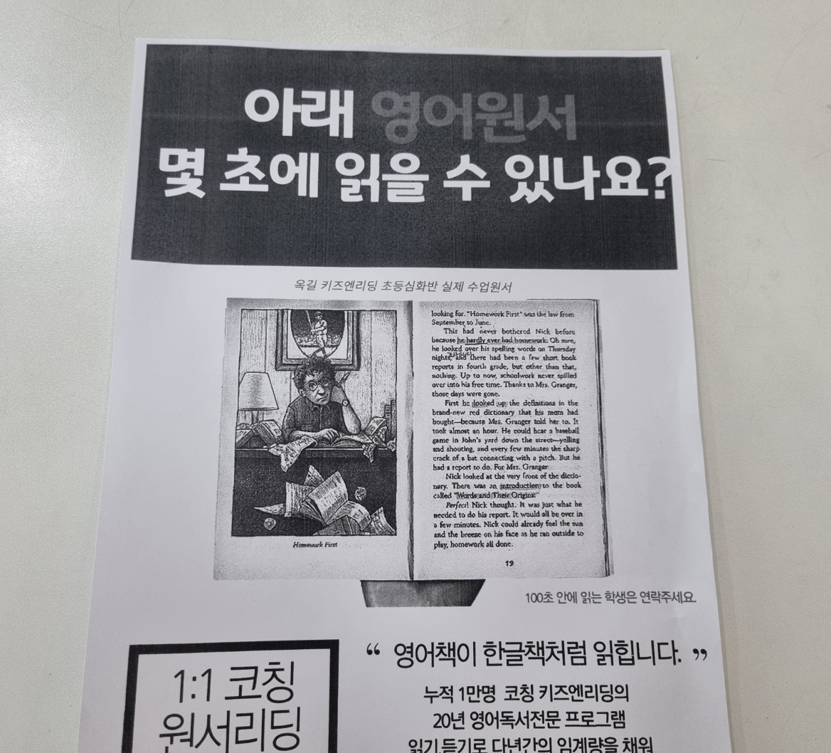 위 전체 페이지를 100초 안에 한글책처럼 술술 읽는 초등학생들이 모여서 공부하는 영어공부방 학원이다.