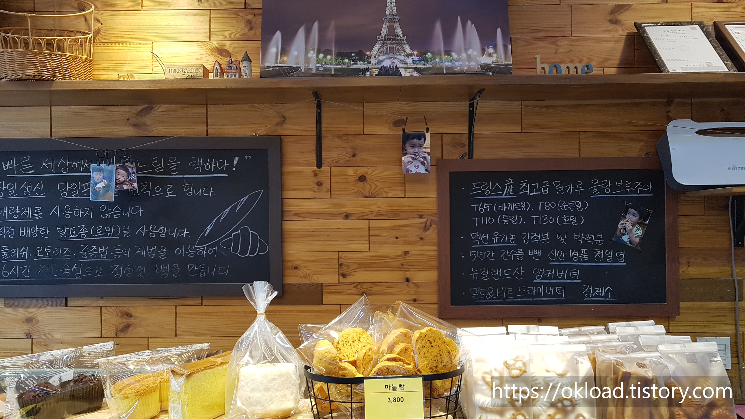 판서에서 제일 먼저 눈에 들어온 것은 다름 아닌, 사장님의 자녀로 보이는 아이의 사진이었다. 어린아이가 빵을 먹고 있는 사진인데, 이 사진 몇 장으로 믿고 먹을 수 있는 빵을 만들겠다는 사장님의 빵집 운영 철학이 고스란히 담겨있음을 느낄 수 있었다.