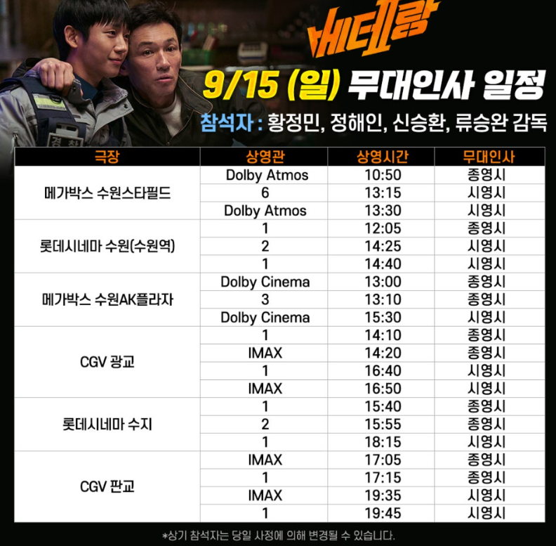 추석연휴 9월 15일(일)에 영화 베테랑2 배우 및 감독이 경기도 수원, 광교, 수지, 판교 등 영화관을 방문하여 무대인사할 예정이다.