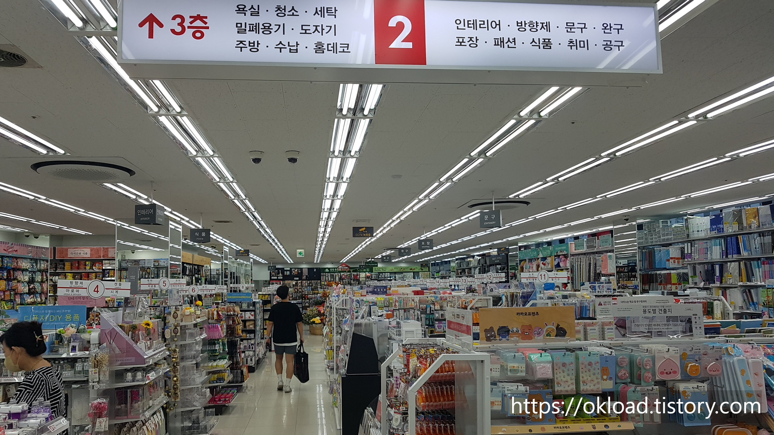 2층부터는 넓은 판매 공간을 자랑하는 다이소 옥길범박동점이다. 다른 지역의 다이소를 여러 곳 다녀봤지만, 규모나 품목에 있어서 전혀 뒤지지 않는 부천범박 다이소다.