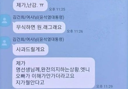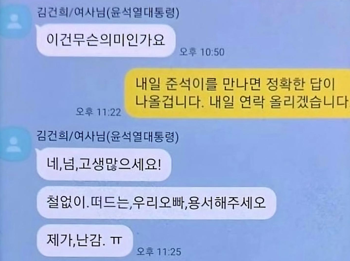 '김건희/여사님'이라고 표시되어 있는 인물은 "넘,고생많으세요! 철없이 떠드는 우리 오빠 용서해 주세요. 제가 난감"등 일상적인 편한 문체로 메세지를 작성하였다.