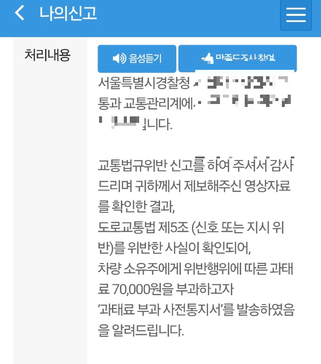 위 나의신고 처리내용 결과를 보면, 신호위반 차량 소유주에게 과태료가 무려 7만 원 부과되었음을 알 수 있습니다.