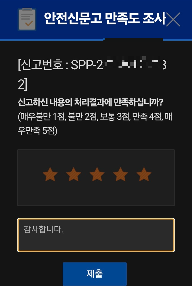신속 정확한 처리결과를 보여주신 경찰관님의 노고에 고마워하며, 안전신문고 만족도 조사도 작성했습니다.