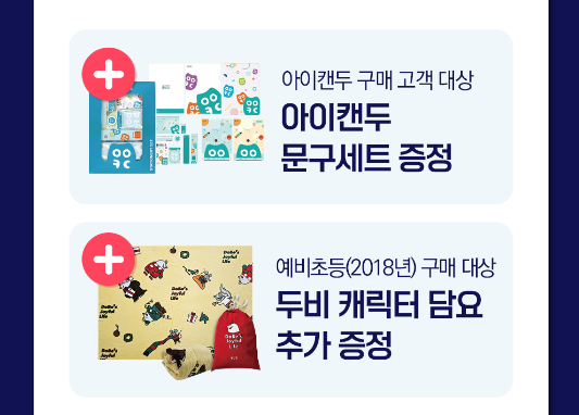 11월에 아이캔두를 구입하는 고객에게 공통적으로 문구세트, 두비 캐릭터 담요를 제공합니다. 단, 두비캐릭터 담요는 예비초등생만 제공됩니다.