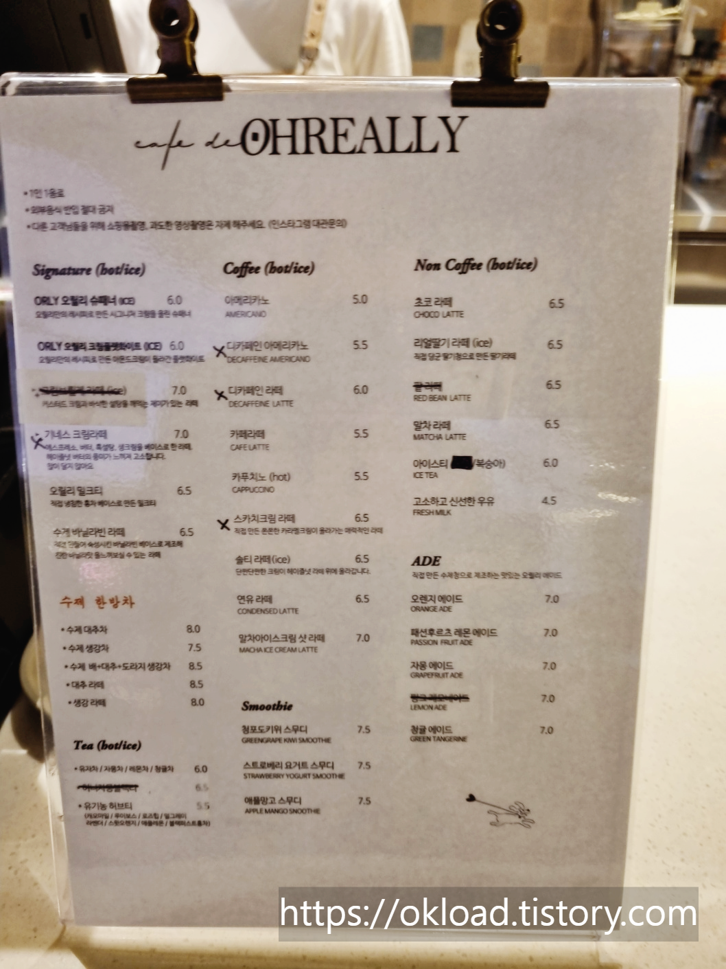 OHREALLY 오릴리 카페 메뉴판 가격