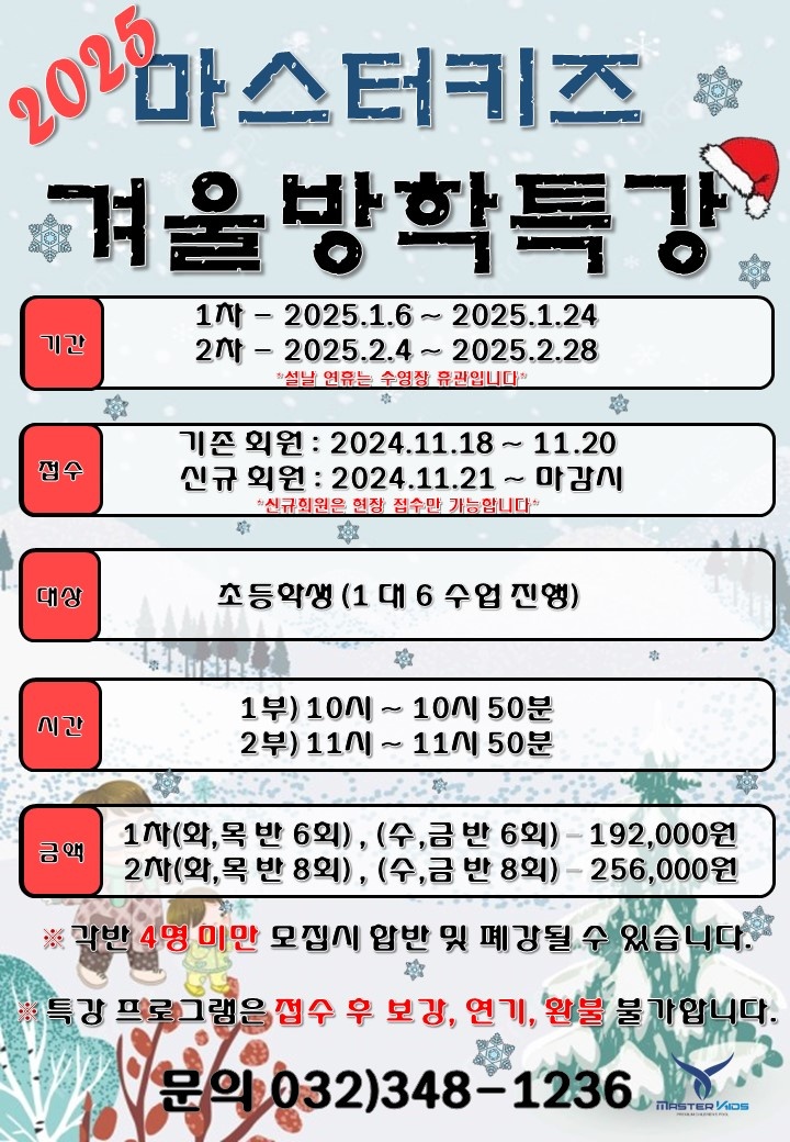 겨울방학 특강 특성상 접수 이후에는 보강, 연기, 환불이 어렵다는 점 유의하시길 바랍니다.