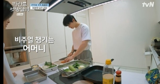 차은우는 엄마가 지켜보는 앞에서 고추잡채와 제육볶음 요리를 만드는데, 영낙없이 우리네 평범한 아들들처럼 엄마에게 투정 부리고 떼를 쓰는 귀여운 모습을 보이는 차은우다.