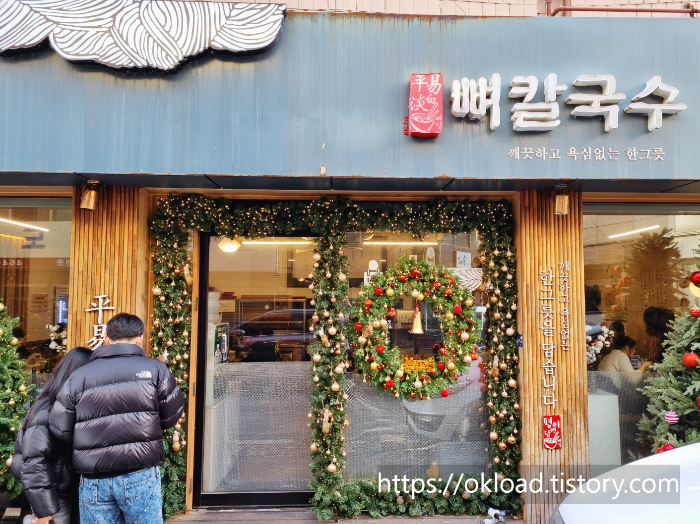 평이담백뼈칼국수 성수점. 번호표를 뽑고 가게 밖에서 10분 정도 웨이팅한 후 입장할 수 있었던 줄서서 먹는 성수동맛집이었습니다.
