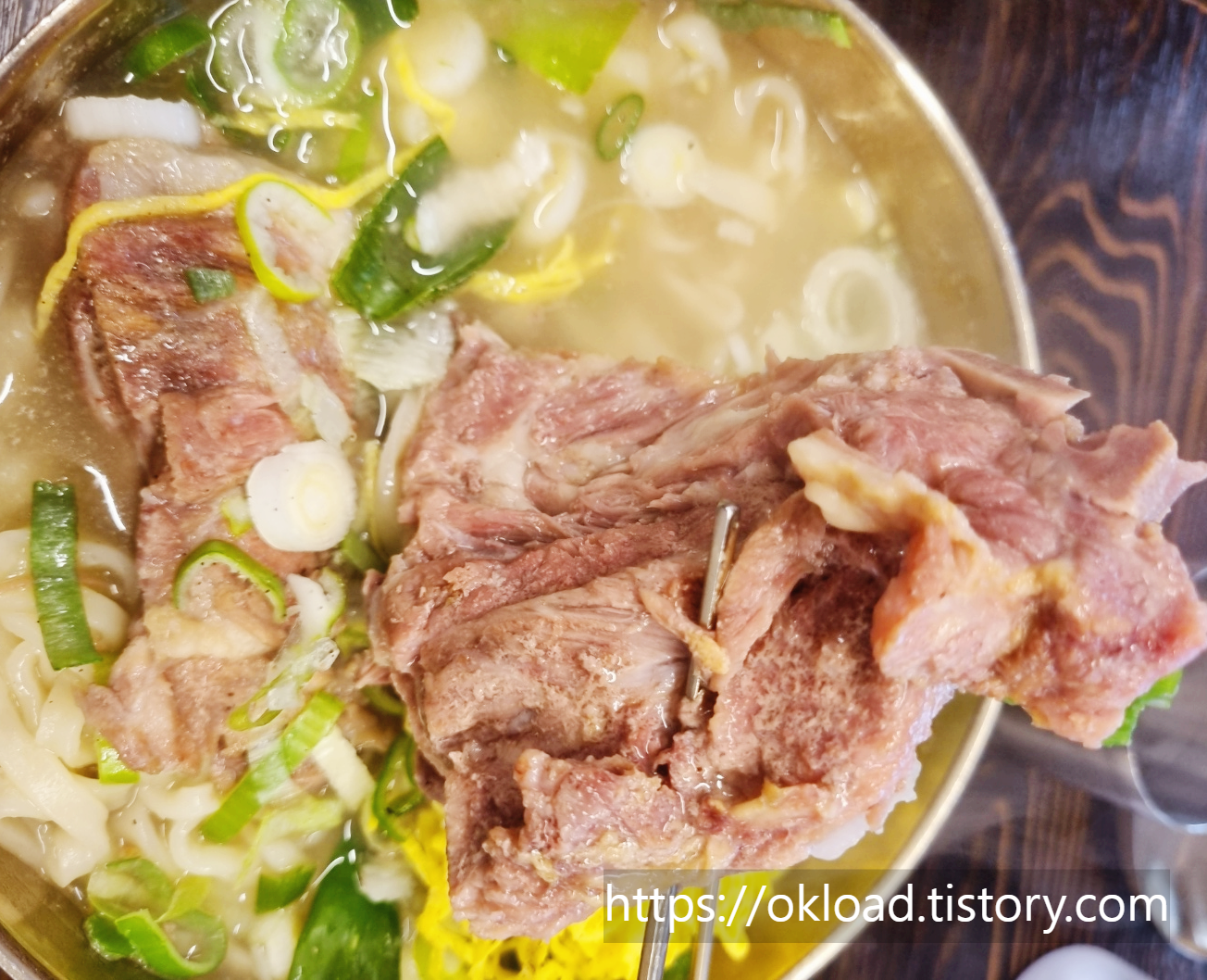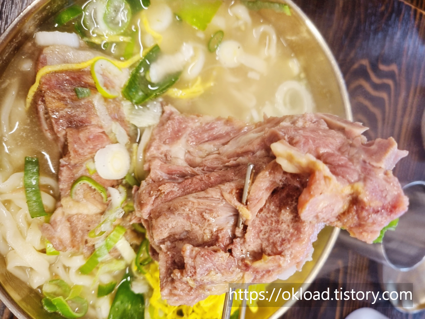 뼈해장국을 괜찮게 조리하는 맛집에서 공수해온듯한 육질 좋은 큰 고깃덩어리 2개가 칼국수 고명과 함께 얹어서 나오는 뼈칼국수다.