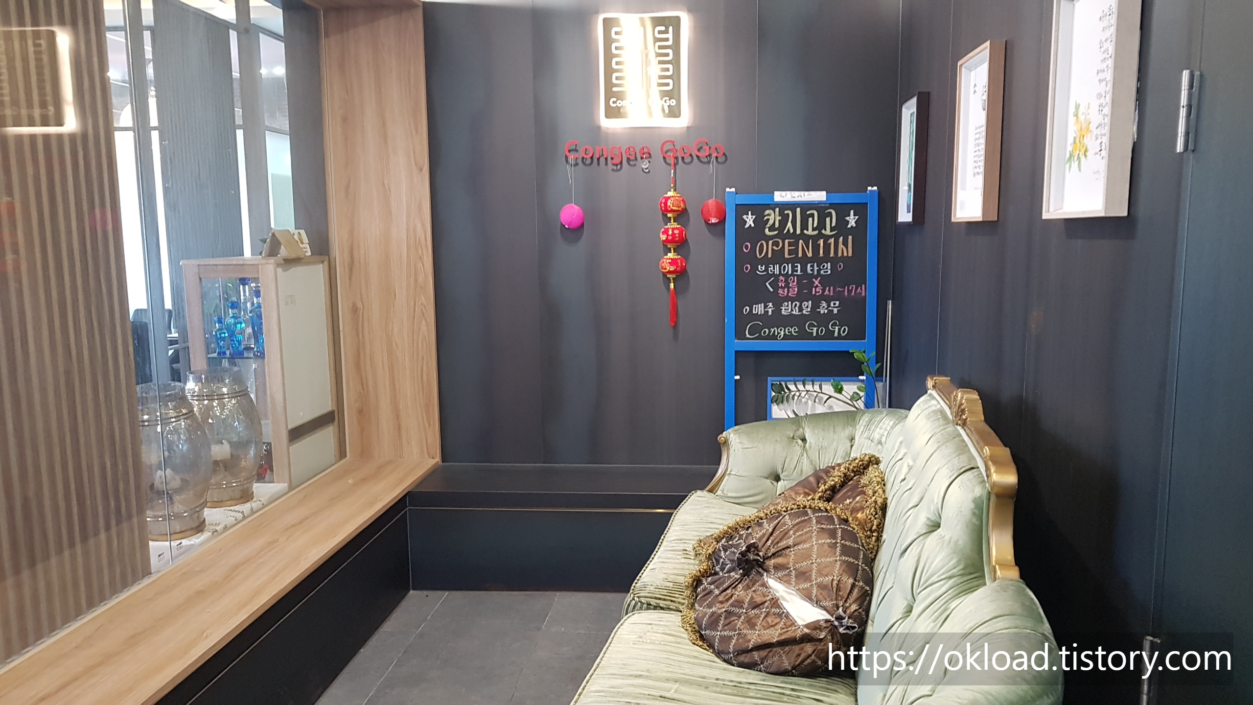 입구에 놓은 황실 스타일의 소파는 인테리어 소품의 하나로 보이며, 손님이 입장 전후에 잠시 앉는 용도로도 사용되지 않을까 싶다. (칸지고고 오픈시간은 11:00이다.)