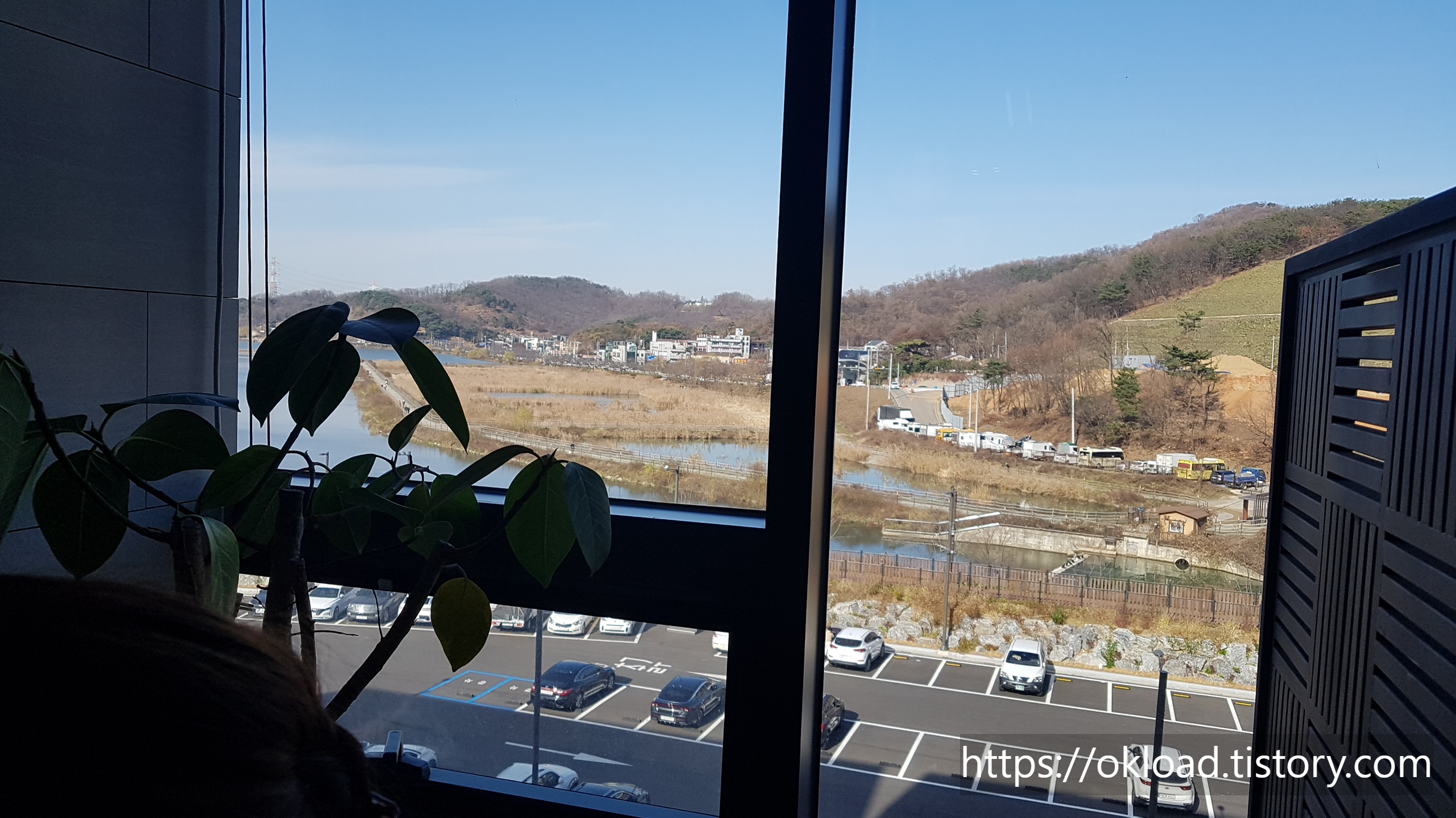 다행히도 호수 끝부분이라도 보이는 창 가장자리 테이블이 비어있어서 아쉬운 대로 고마운 마음으로 자리에 앉았다. 공영주차장과 물왕호수, 나즈막한 산이 보이는 평화로운 전망이다.