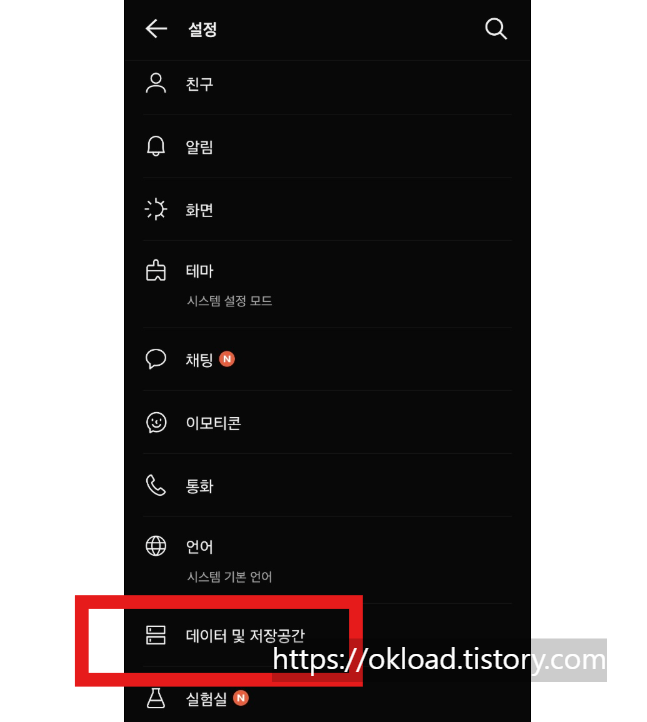 '전체설정' 카테고리 안으로 들어갔다면, 이어서 나열되는 항목들 중에서 '데이터 및 저장공간'을 누릅니다.