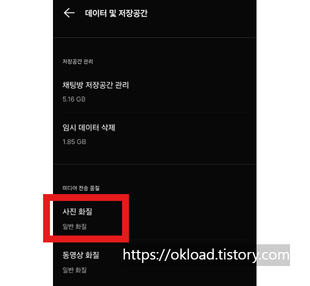 데이터 및 저장공간 - 사진 화질 클릭!!
