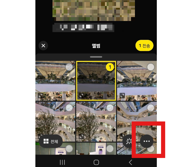 카카오톡 채팅방창 상태애서 사진앨범에서 전송하고자 하는 사진을 선택한 후, 우측하단에 보이는 '점 3개(...)'를 눌러서 전송하고자 하는 사진의 화질을 설정할 수 있습니다.