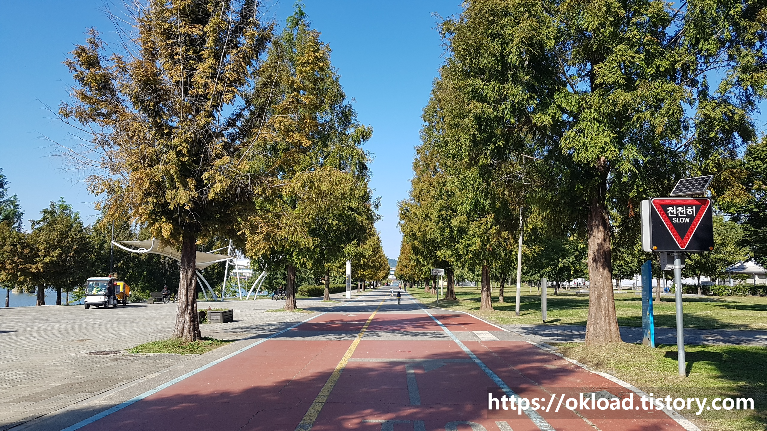 아들과 함께 끝까지 달려보자는 생각으로 이 넓고 긴 직선 길을 뛰어봤는데, 절반도 못 가서 지쳐 걸었다. 넓고 길게 뻗은 가로수길은 시야가 확 트여서 해방감마저 느끼면서 달릴 수 있었다.