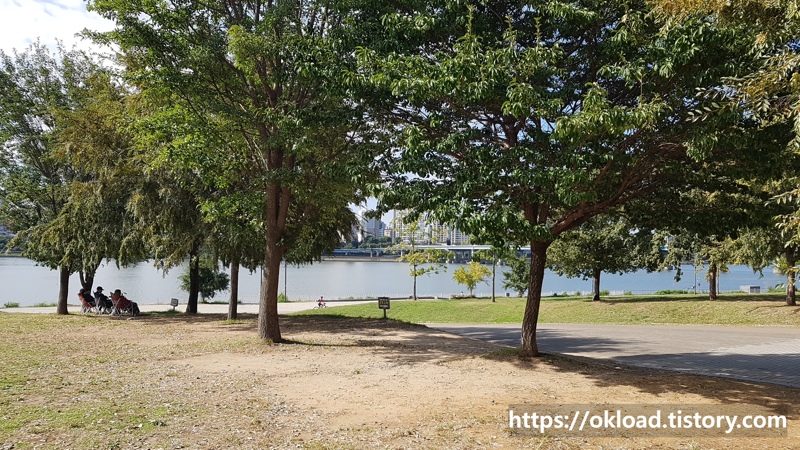 커다란 거목 아래에 간이의자를 펼치고 앉아서 한강을 바라보며 대화를 나누는 가족들의 모습이 많이 보였다. 이 역시 치킨, 피자, 족발 등 먹거리를 잔뜩 펼쳐놓고 취식하는 모습이 흔한 여의도 한강시민공원과 대비되는 장면이었다.