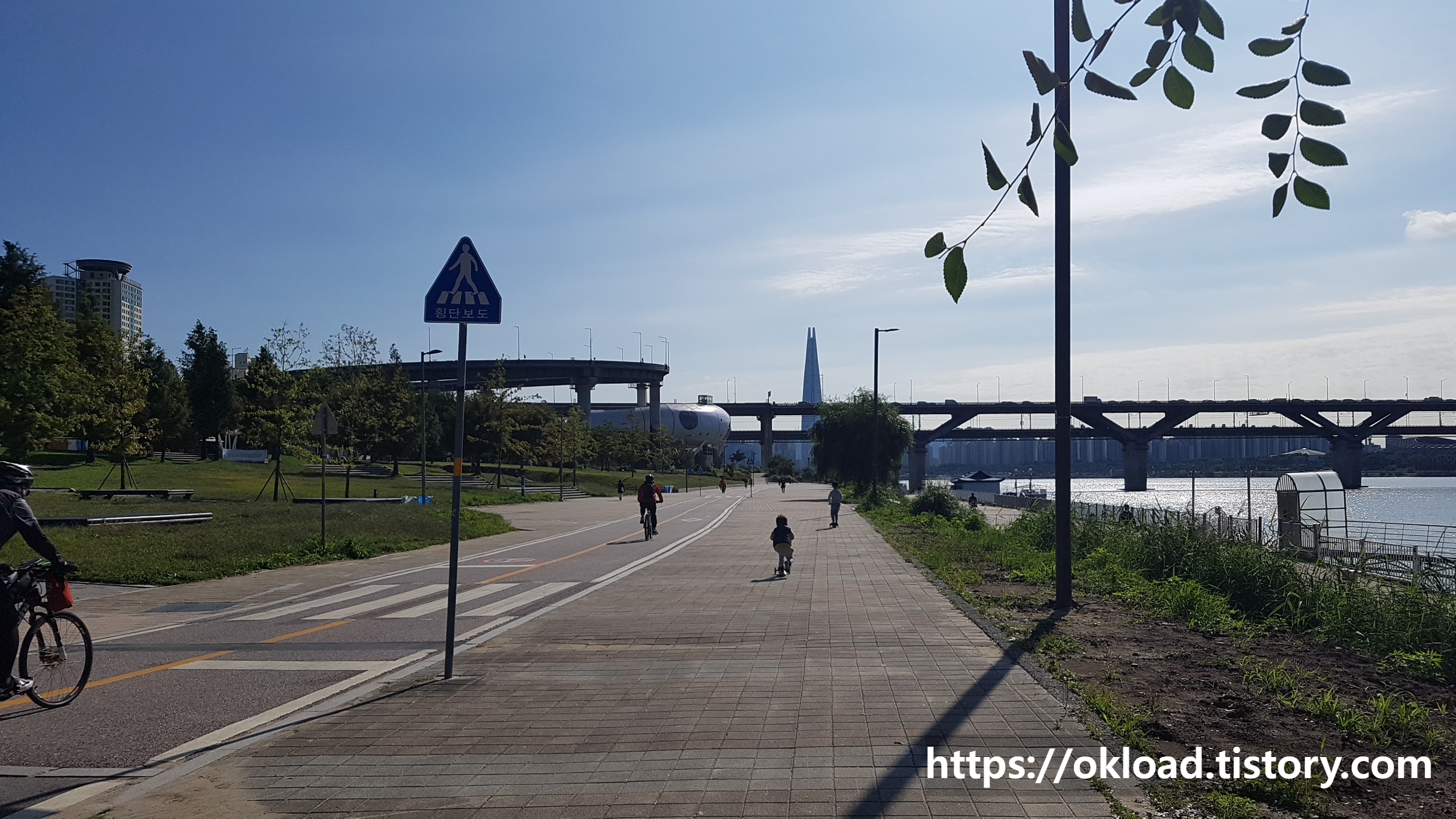 주차장에서 내린 아들은 바로 킥보드를 타고 질주하기 시작했다. 여의도시민공원에 비해서 한강을 따라 조성된 길이 넓은 편이고, 보다 안전하게 유아 및 어린이가 킥보드나 자전거를 타기 좋다. 집, 공원, 차 등등 일단 크고 넓어야 좋다.