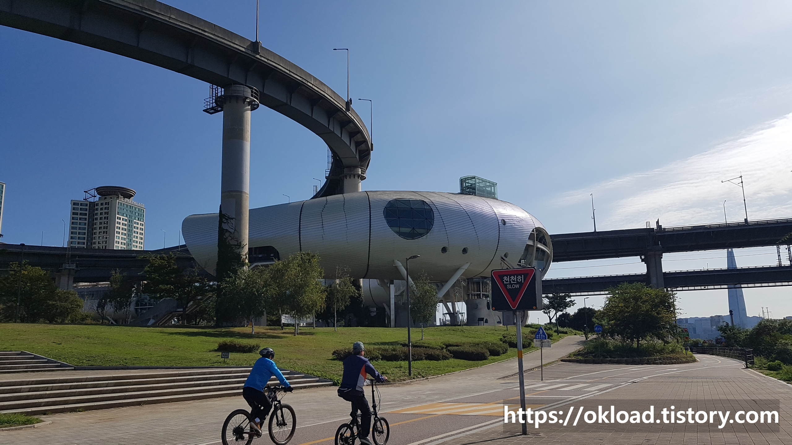 뚝섬유원지 이름모를 외계선 같은 건축물을 멀리서 바라본 장면이다. 저 멀리로 국내에서 가장 높은 고층건물인 123층 롯데타워도 보인다. 파리 시내에 에펠탑이 있다면, 대한민국 서울에는 상징적으로 롯데타워가 있다.