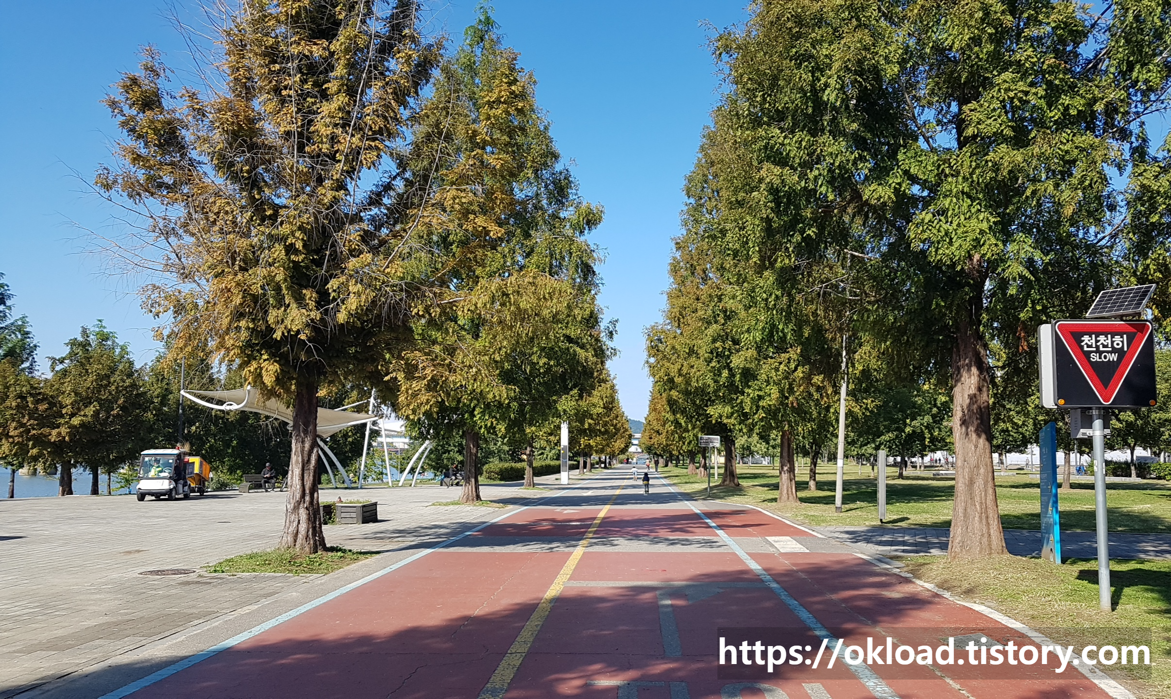 뚝섬유원지역 반대 방향으로는 이렇게 높은 나무들 사이로 잘 포장된 길이 펼쳐져 있다. 꽤나 긴 거리를 직선으로 달릴 수 있는 넓고 곧은 길이다. 한강을 옆에 두고 이렇게 아름다운 길이 있다는 게 놀랍다.