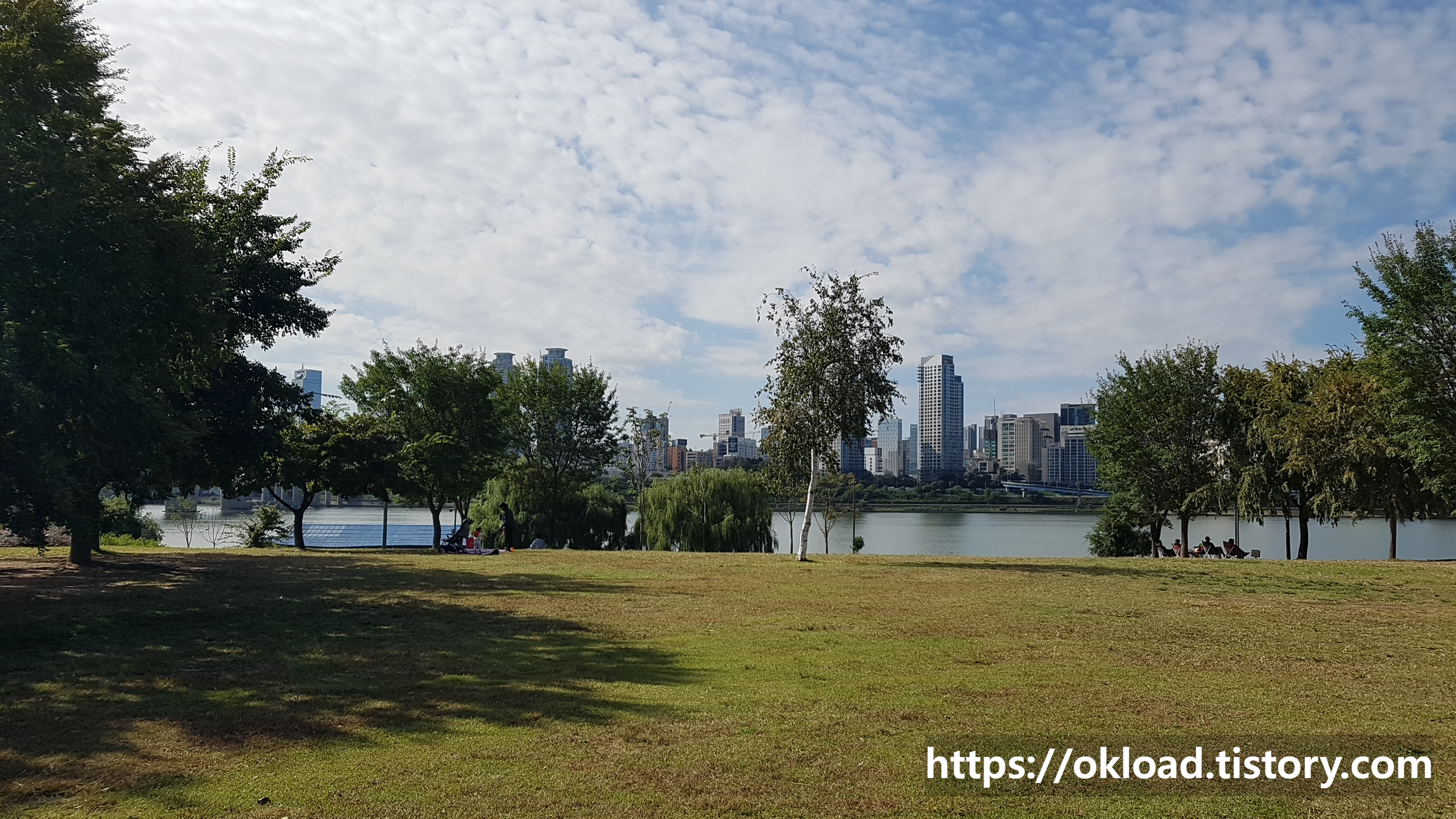 그리고 한강쪽을 바라보면, 넓은 잔디밭과 잎이 울창하고 높은 나무들이 중간중간 자리 잡고 있다. 이 또한 여의도 쪽 한강공원과는 사뭇 다른 분위기를 연출하는 뚝섬유원지공원이다.