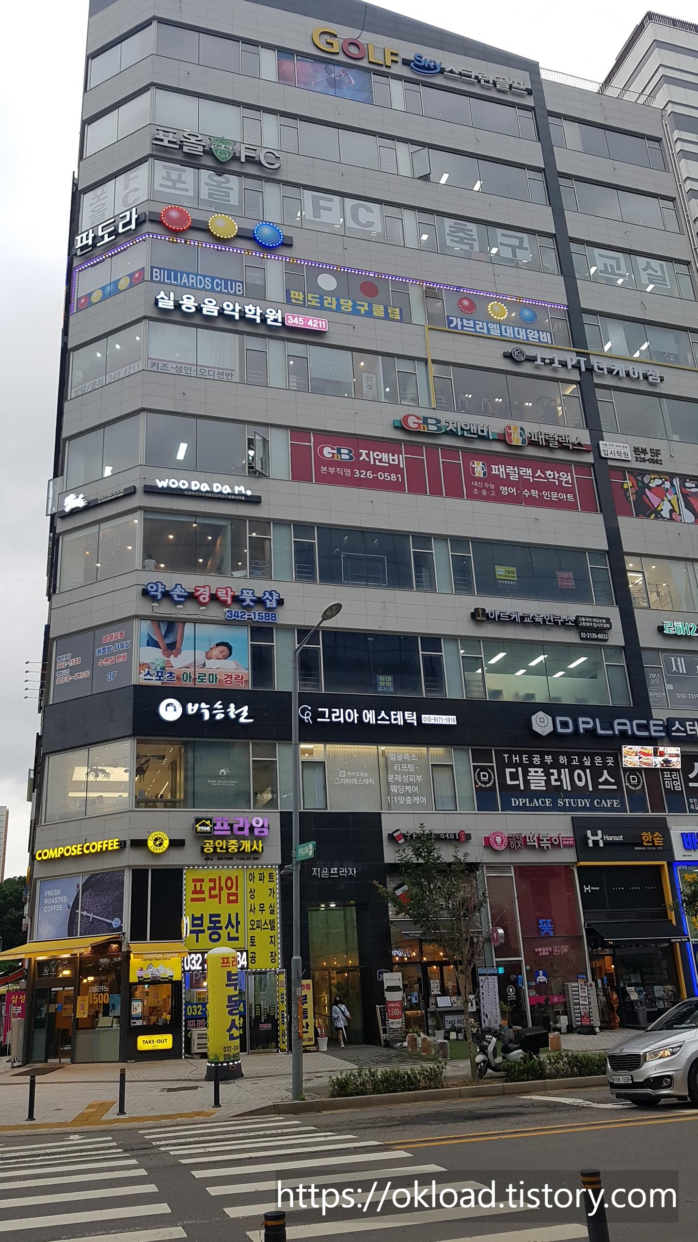 부천시 양지로 208에 위치한 부천 옥길 대표 상가건물에 대하여 소개한다. 지음프라자는 부천 옥길지구 퀸즈파크 및 소사경찰서 부근 상가지역에 위치하며, 지음프라자 건물에 입점한 업체에 대한 정보를 소개하려 한다. 먼저 지음프라자 외관을 여러 방향으로 사진 촬영했다.