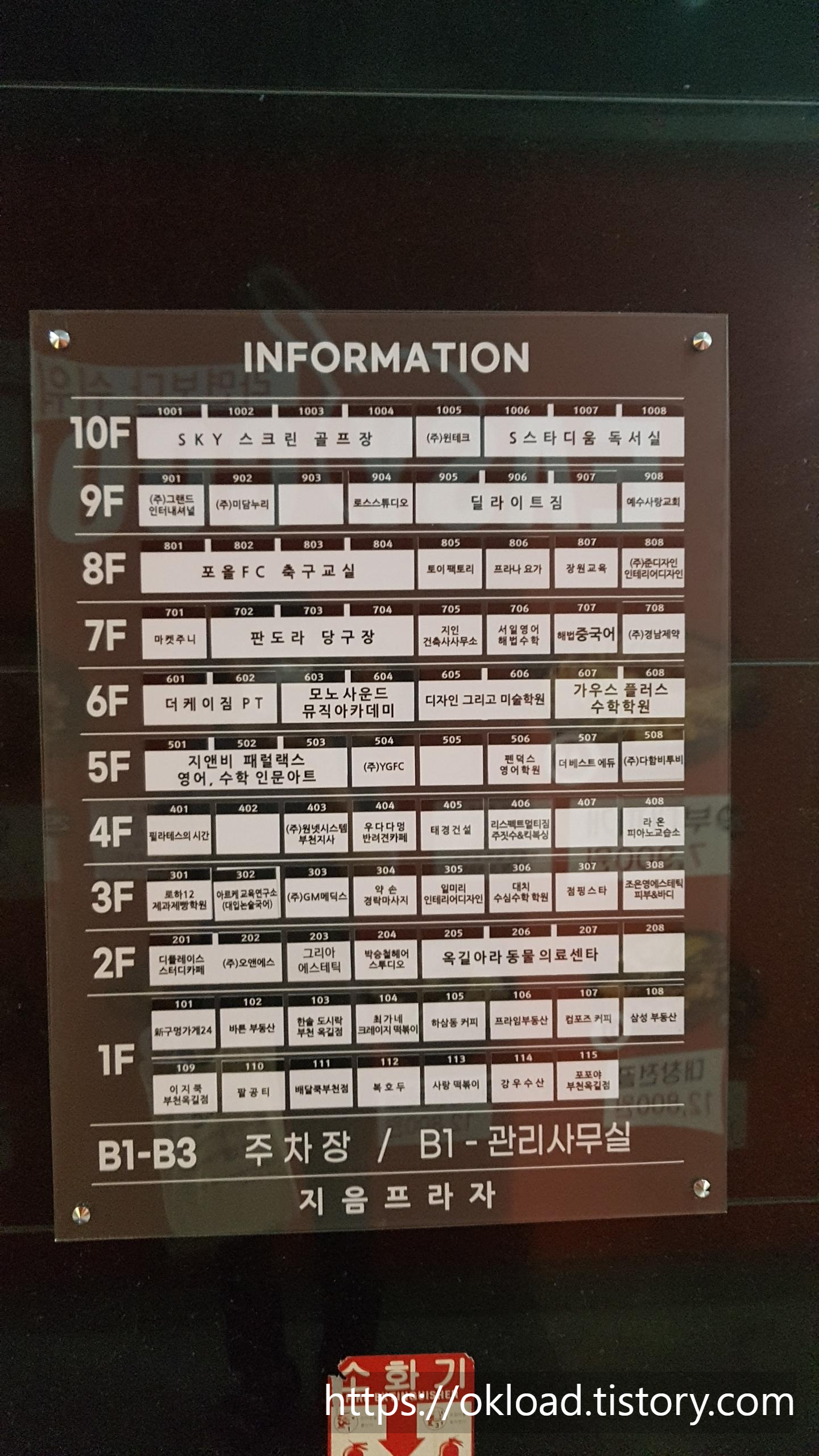 | 9층 | (주)그랜드인터내셔널, (주)미달누리, 로스스튜디오, 딜라이트짐, 예수사랑교회 |